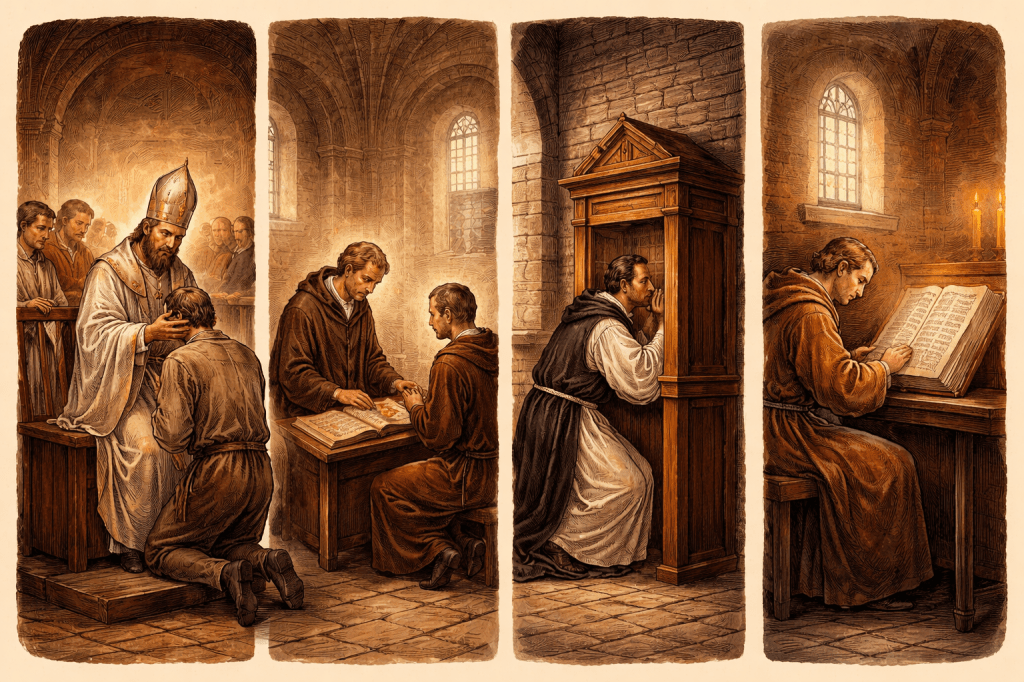 As Christian populations grew, public confession became pastorally difficult and spiritually discouraging for many believers. During this period, confession increasingly took place privately before the bishop or a priest, while reconciliation remained public. This transitional approach is seen in late patristic writers and regional practices, particularly in the East and West, as the Church sought a more merciful and repeatable way to restore sinners without abandoning apostolic authority.
